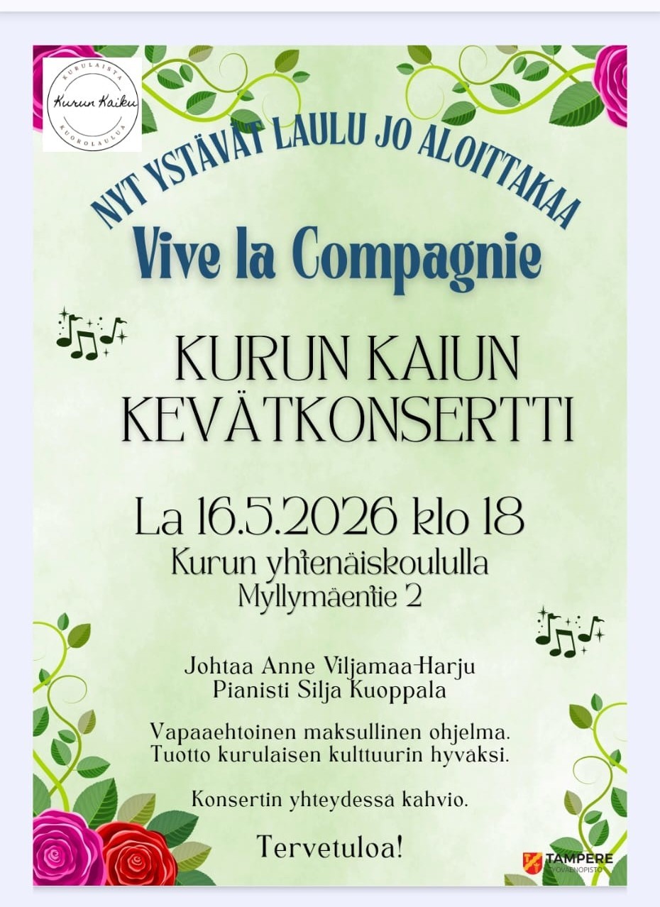 Tervetuloa iloiseen kevätkesän avaukseen Kurun Kaiku sekakuoron kevätkonserttiin, joka järjestetään uudessa ja upeassa Kurun yhtenäiskoulussa. Konsertissa esitetään kuoroklassikoita ja uudempiakin lauluja. Konsertti sopii kaiken ikäisille ja yleisötila on esteetön sekä maksuton. Konsertissa on perinteiseen tapaan vapaaehtoisella summalla ostettavissa konsertin ohjelma sekä lisäksi erikseen ostettavissa kahvi- ja mehutarjoilua. Tapahtuman tuotolla tuetaan kurulaista kulttuuria.