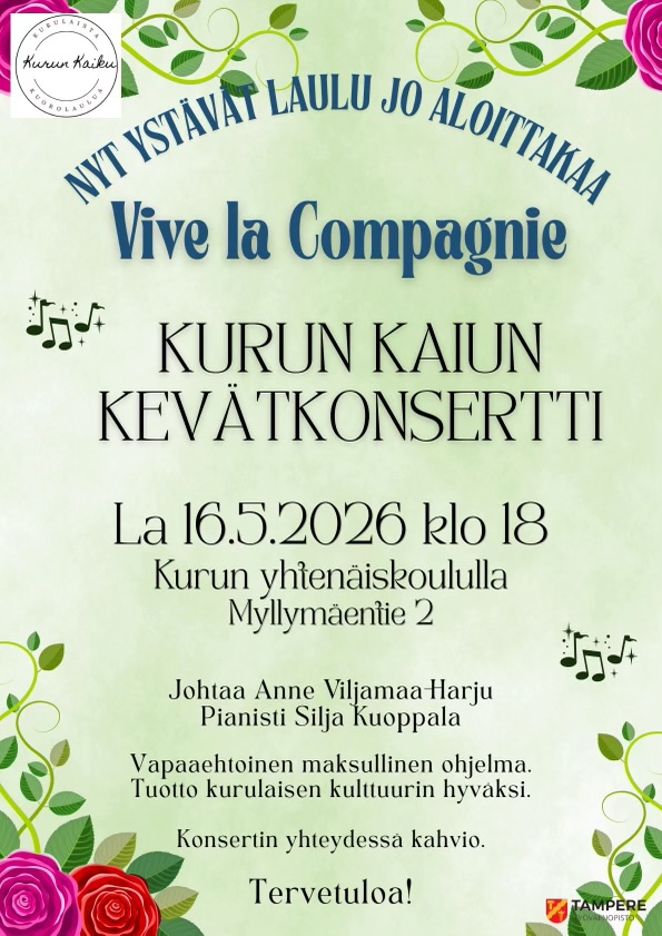 Kun iltaan valo pehmenee ja kevät alkaa olla kauneimmillaan, täyttyy Kurun yhtenäiskoulu laulusta. Luvassa on jälleen Kurun Kaiun lämminhenkinen kevätkonsertti 16.5. klo 18.00. Konsertin johtaa Anne Viljamaa-Harju ja pianolla säestää […]